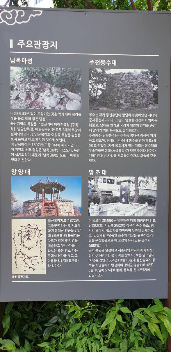주전봉수[남목봉수]는 주전동 봉대산 정상에 위치하고 있으며, 천내(川內)에서 봉수를 받아 유포(柳浦)로 전했다.