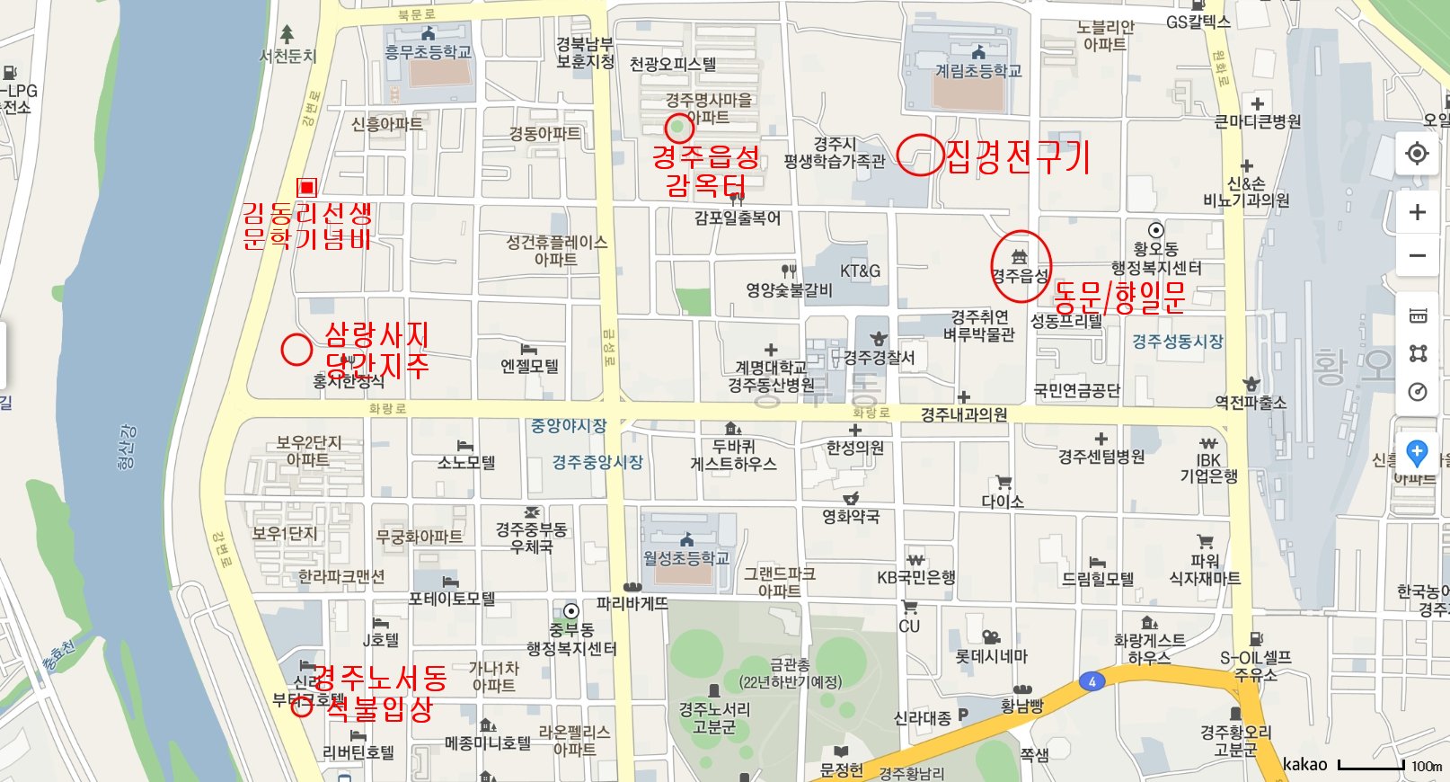 이동 경로 : 경주읍성 동문 - 집경전구기 - 감옥터 - 김동리 문학기념비 - 삼랑사지당간지주 - 노서동 석불입상 -
