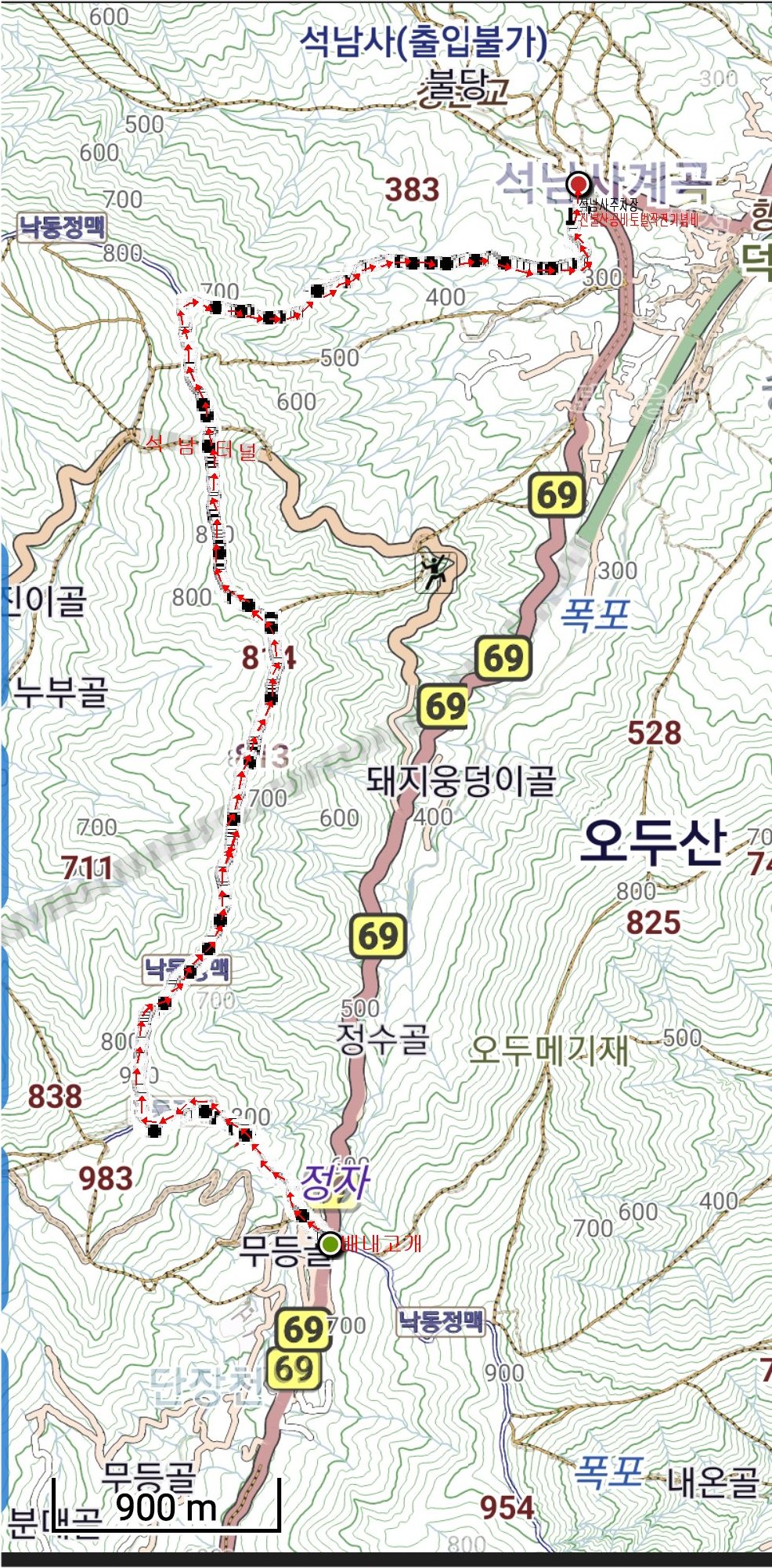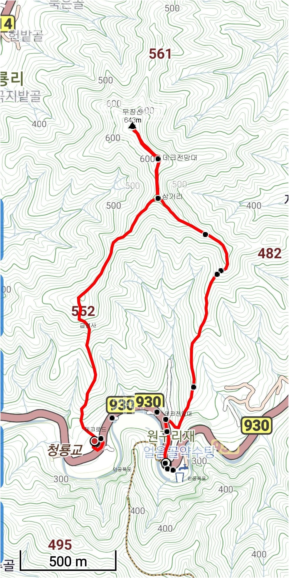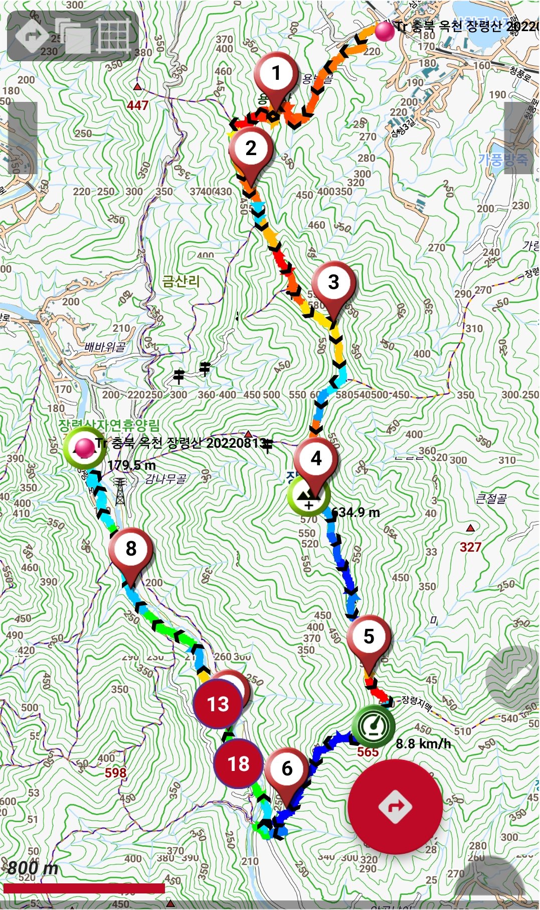 여주/충주,음성 오갑산 20220901 목 한마음 코스 : 관한1리(새터)주차장 - 어우재미술관 삼거리에서 좌향 - 청노들계곡 - 오사고개(429m) - 완장봉(555.8m) - 국수봉(585m) - 진터(567m) - 오갑산(609.1m,이진봉) - 서천고개 - 옥녀봉(삼태봉, 499m) - 개금골삼거리 - 기댈곶교회 - 새터주차장 한남금북정맥에서 분기한 부용지맥이 수레의산에서 북으로 갈라지는 능선이 오갑지맥이다. 오갑지맥은 원통산(655.6m)을 지나 서쪽 음성군 감곡면과 동쪽 충주시 앙성면 경계를 이루며 북으로 이어진다. 이후 중부내륙고속도로를 횡단한 뒤 이문고개를 지나 오갑산(梧甲山 609.4m)에 이른다. 오갑산은 경기도 여주시 점동면과 충북 음성군 감곡면, 충주시 앙성면 경계. 삼국시대엔 오압..